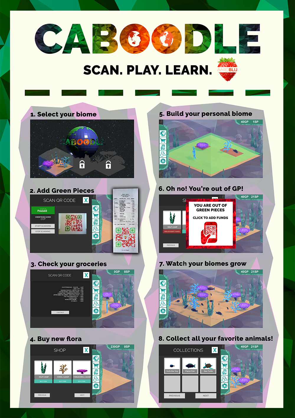 Caboodle is a serious game designed to confront users on the impact they are making to the environment based on their choice of groceries. In the game users have several “habitats” they take care of. By planting flora they attract fauna, the goal of the game being to “collect” all the available fauna by spotting them in the habitats.